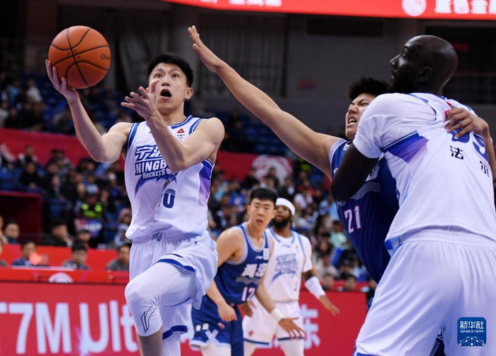 4月12日,宁波町渥队球员刘晓宇(左)在比赛中上篮。