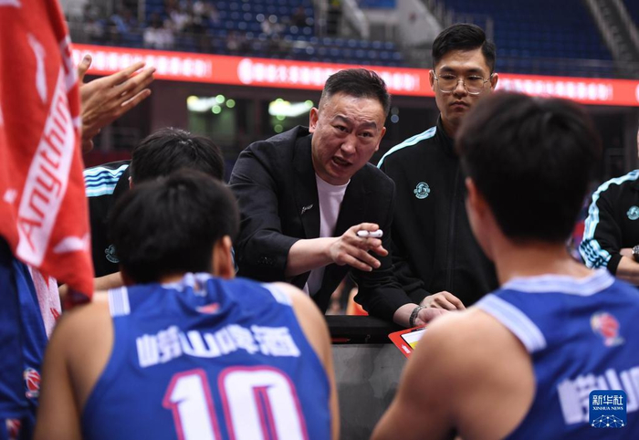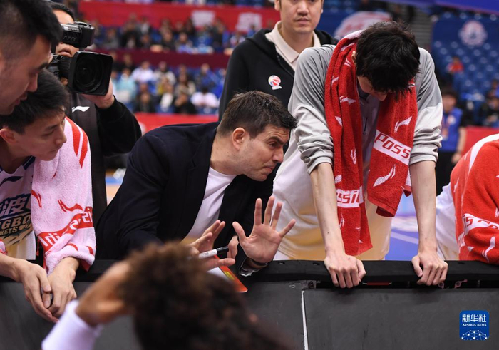 4月12日,青岛崂山啤酒队主教练刘维伟(中)在比赛间隙布置战术。
